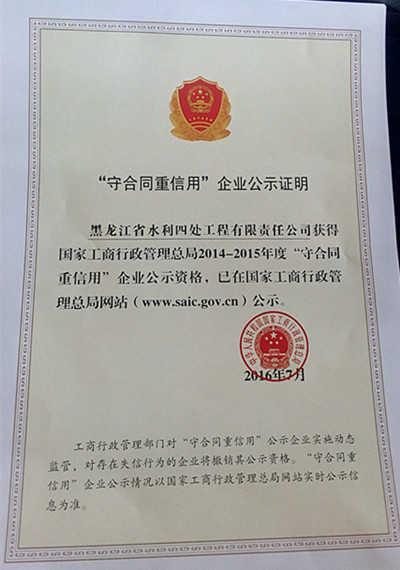 2014-2015年度國(guó)家級(jí)“守合同重信用企業(yè)”證書