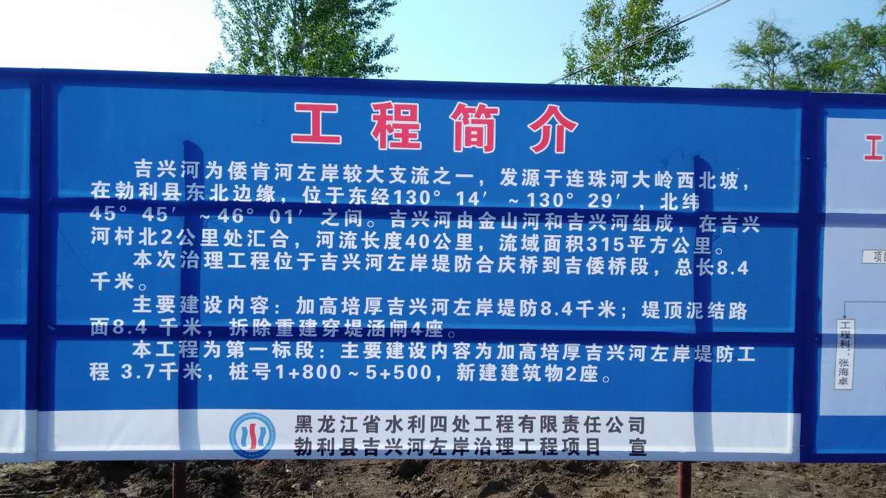 主要建設(shè)內(nèi)容為加高培厚吉興河左岸堤防工程 3.7千米,樁號1+800~5+500,新建建筑物2座。工程總造價:6695701.00元。