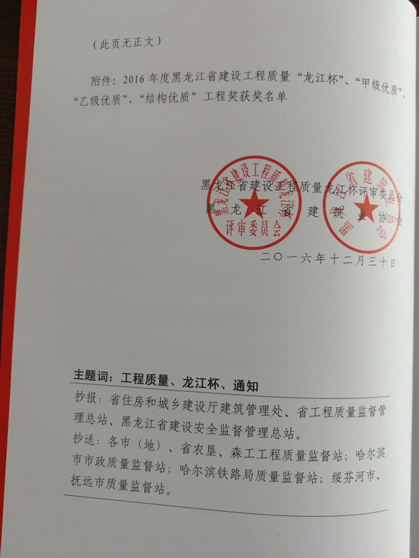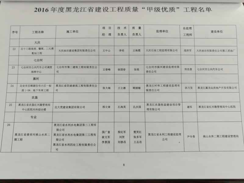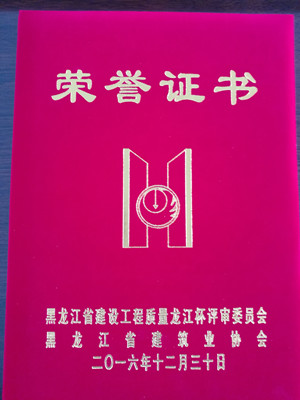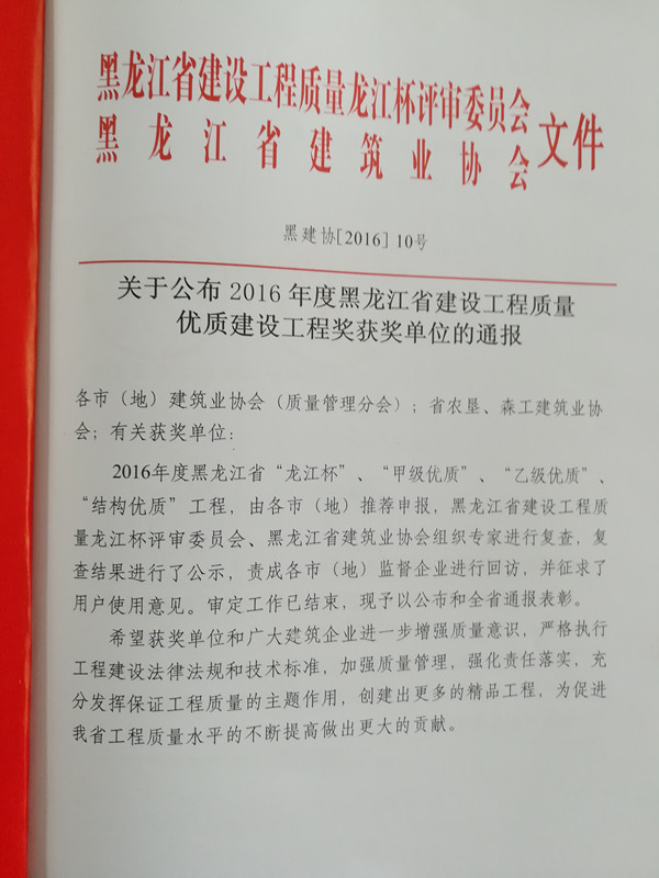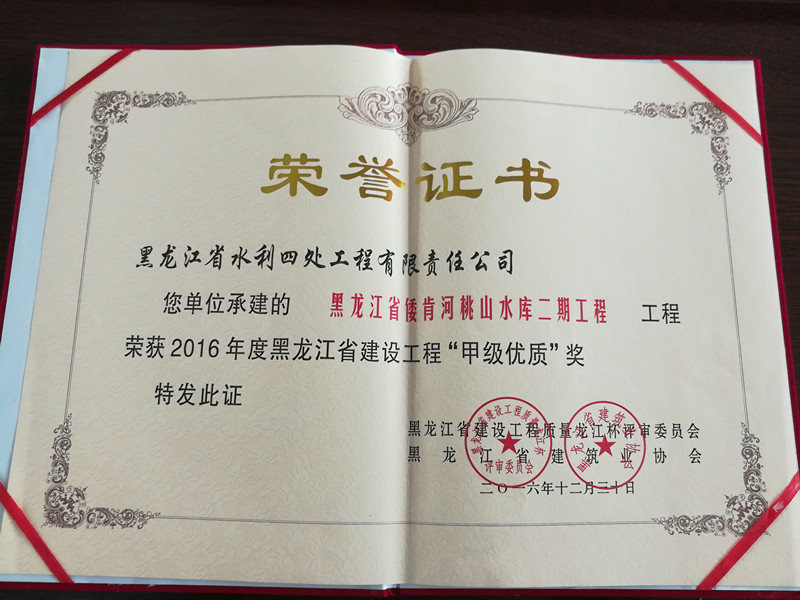 我公司承建的七臺(tái)河市倭肯河桃山水庫二期工程,被黑龍江省龍江杯評審委員會(huì)、黑龍江省建筑業(yè)協(xié)會(huì)評為2016年度全省建設(shè)工程質(zhì)量甲級(jí)優(yōu)質(zhì)工程,獲獎(jiǎng)證書、光榮冊和獎(jiǎng)牌于日前一并發(fā)放到我公司手里。