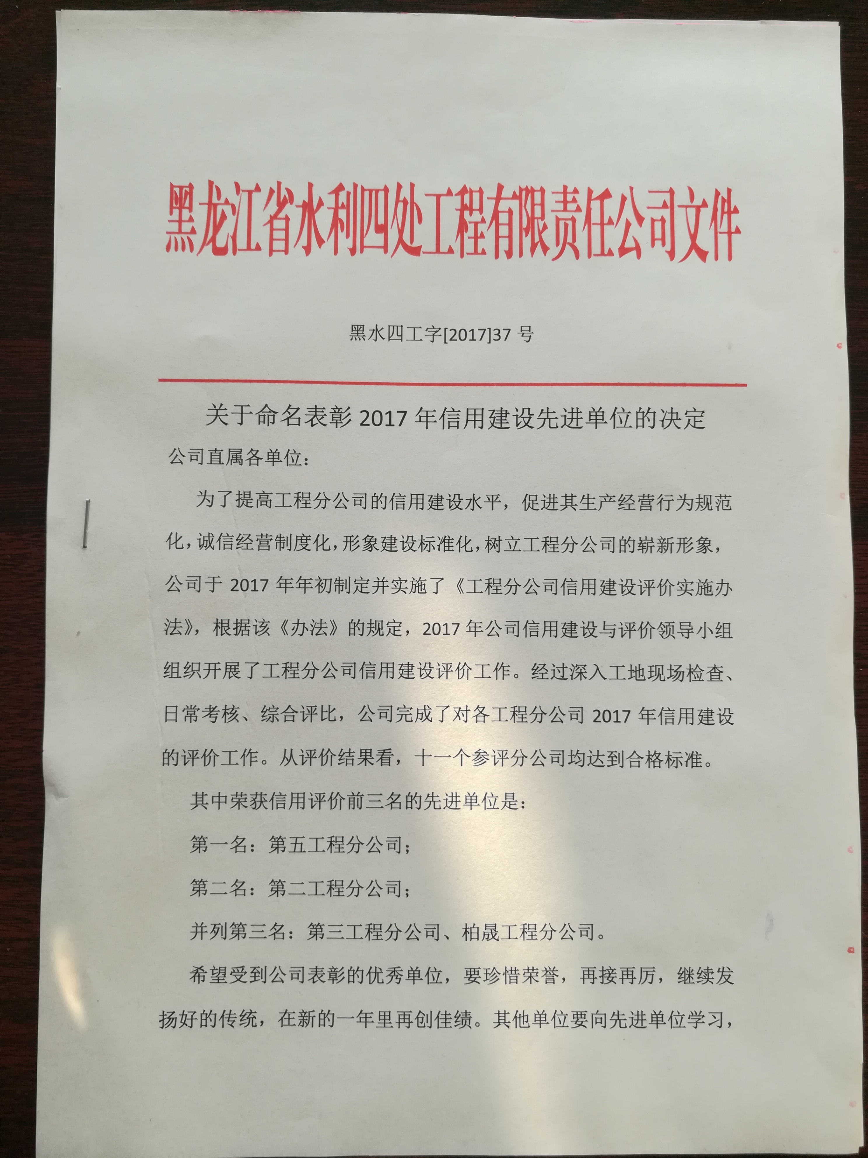 2017年榮獲信用評價(jià)前三名的先進(jìn)單位是:第一名:第五工程分公司;第二名:第二工程分公司;并列第三名:第三工程分公司、柏晟工程分公司。