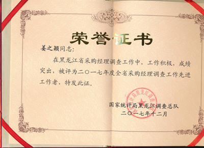 在黑龍江省采購(gòu)經(jīng)理調(diào)查工作中,困工作積極,成績(jī)突出,我公司生產(chǎn)經(jīng)營(yíng)管理部長(zhǎng)副部長(zhǎng)、統(tǒng)計(jì)負(fù)責(zé)人姜之穎同志日前被國(guó)家統(tǒng)計(jì)局黑龍江調(diào)查部隊(duì)授予“2017年度黑龍江省采購(gòu)經(jīng)理調(diào)查工作先進(jìn)工作者“榮譽(yù)稱(chēng)號(hào)。