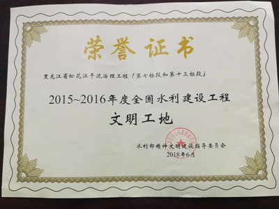 2018年6月26日,我公司承建施工的松花江干流治理工程第十三標(biāo)段,被國家水利部文明委授予“2015—2016年度全國水利建設(shè)工程文明工地”稱號。
