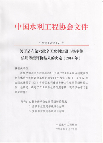 九月二十三日,從中國(guó)水利工程協(xié)會(huì)網(wǎng)站傳來(lái)利好消息:我公司一舉將全國(guó)水利行業(yè)信用等級(jí)評(píng)價(jià)殊榮攬入懷中,既獲評(píng)中國(guó)水利工程協(xié)會(huì)“全國(guó)水利建設(shè)市場(chǎng)主體信用等級(jí)評(píng)價(jià)AAA級(jí)施工單位稱號(hào)”。