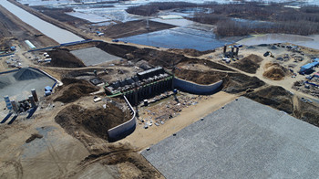 2017年,形象進度為中總干渠圍堰填筑、青四干導流開挖全部完成,土方開挖完成26.7%,防滲墻灌注樁全部完成,防滲墻旋噴樁全部完成,站身基礎(chǔ)砼預制管樁全部完成。