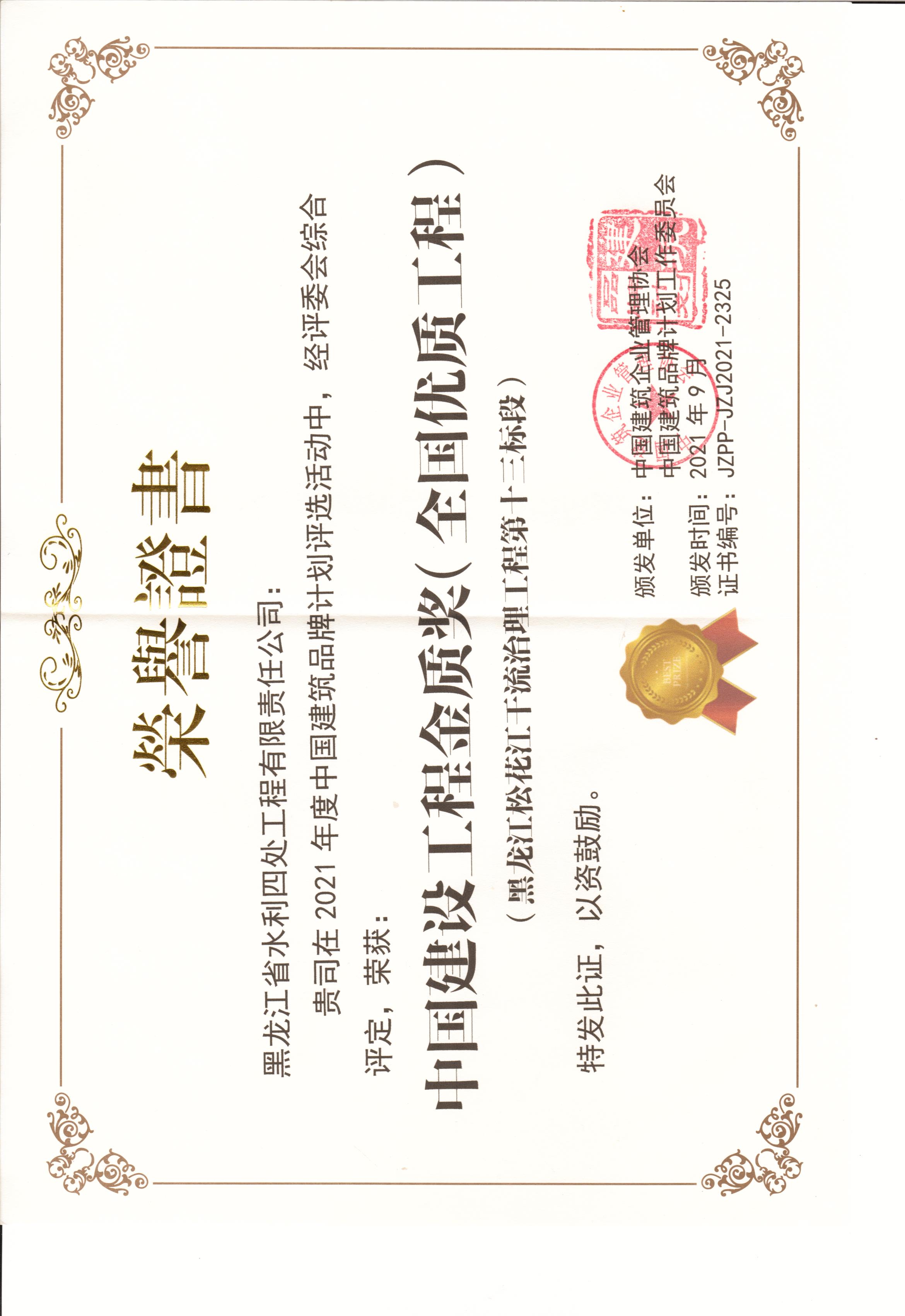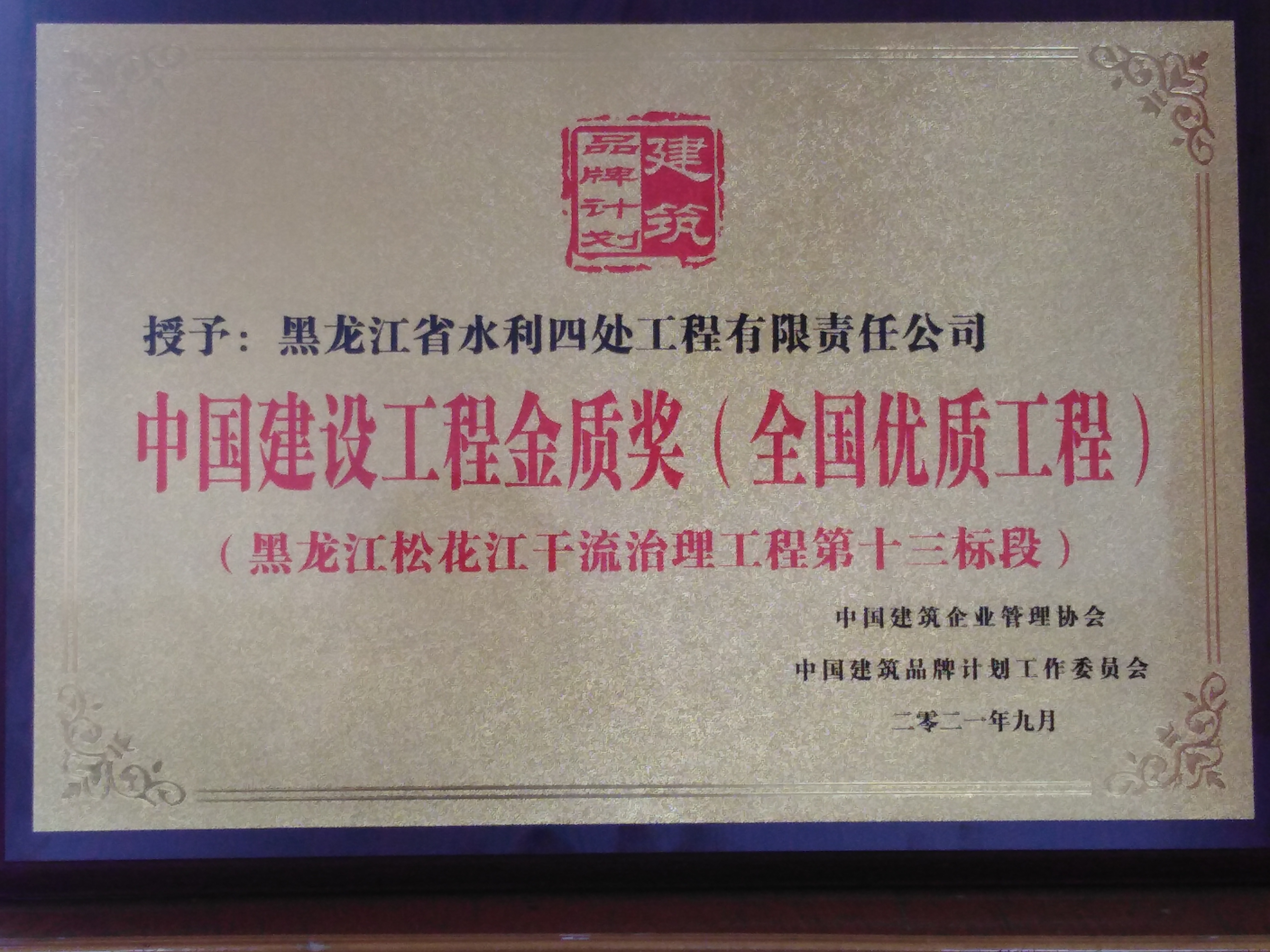 2021年9月,在2021年度中國建筑品牌計(jì)劃評(píng)選活動(dòng)中,經(jīng)評(píng)委會(huì)綜合評(píng)定,我公司被中國建筑企業(yè)管理協(xié)會(huì)、中國建筑品牌計(jì)劃工作委員會(huì)授予“中國建設(shè)工程金質(zhì)獎(jiǎng)(全國優(yōu)質(zhì)工程)”。