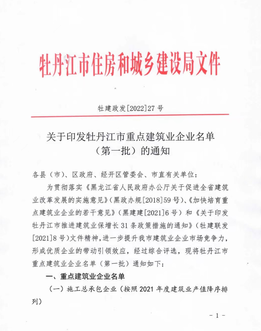 近日,牡丹江市住房和城鄉(xiāng)建設(shè)局下發(fā)文件牡建政發(fā)【2022】27號《關(guān)于印發(fā)牡丹江市重點(diǎn)建筑企業(yè)名單(第一批)的通知》,我公司霍然躋身全市施工總承包重點(diǎn)企業(yè)行列,名居前二甲。